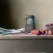 Twee uien op een plank. Olieverf op paneel, met lijst.